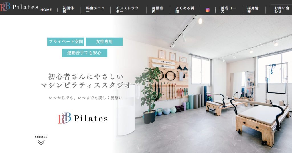 ピラティススタジオ RB-Pilates 松山店は、完全個室・女性専用でマンツーマン指導が受けられるマシンピラティススタジオです。