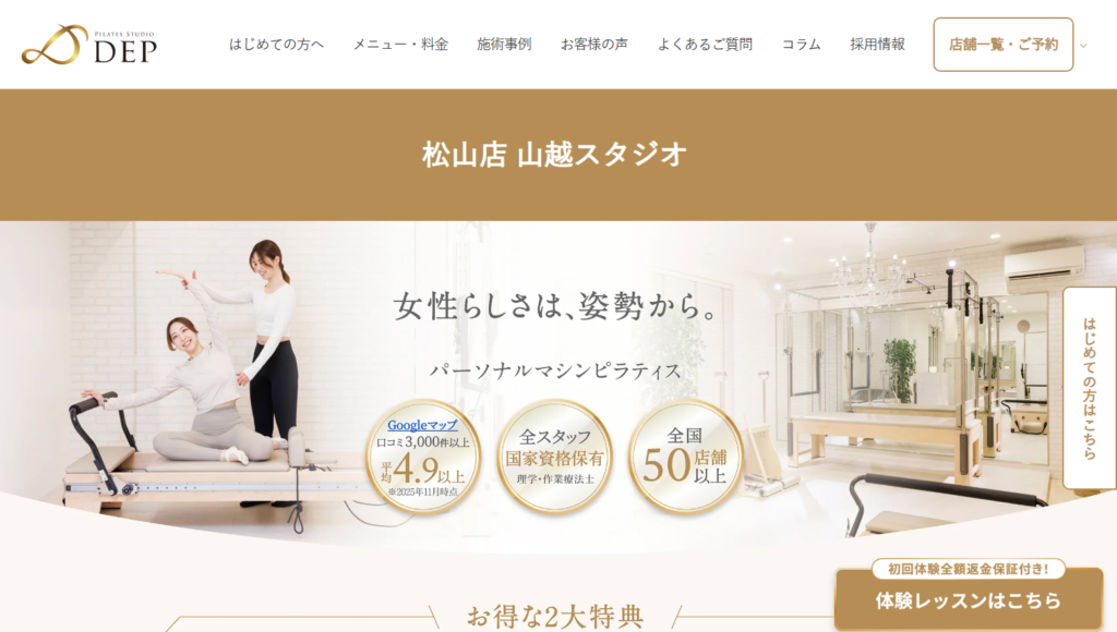 ピラティススタジオDEP 松山店 山越スタジオは、理学療法士資格を持つスタッフが在籍する松山のマシンピラティススタジオです。